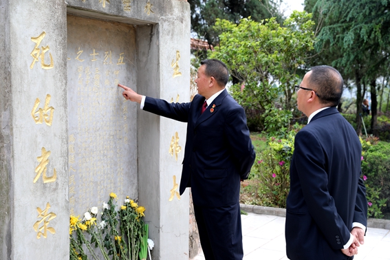 在庄严肃穆的气氛中,党员干警向革命英魂敬献了鲜花,面向纪念碑默哀致敬,并在烈士墓前重温入党誓词。铿锵有力的誓言,表达了对党的忠诚、对共产主义事业的追求和对中国特色社会主义道路的坚定信念。随后,大家瞻仰了烈士墓群,参观了陈列室,重温了革命先烈的英雄事迹,表达对革命先烈的深深敬意。
