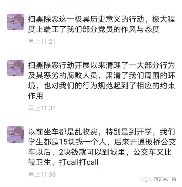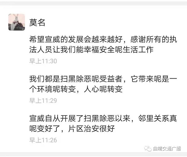 微信网友“莫名”留言:宣威自从开展扫黑除恶以来,邻里关系变好了,片区治安很好,我们都是受益者,它带来的是环境的转变,人心的转变,希望宣威的发展越来越好,感谢所有的执法人员让我们能幸福安全的生活工作。