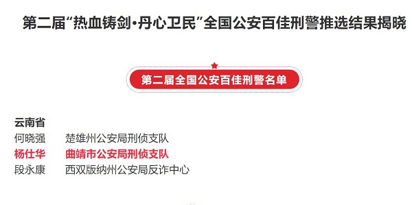 近期,由公安部刑侦局、新闻宣传局、人民公安报社共同举办的第二届“热血铸剑·丹心卫民”全国公安百佳刑警推选宣传活动正式开启。经各地公安机关推荐、网上点赞和专家评审,12月10日,推选结果揭晓,曲靖市公安局刑侦支队民警杨仕华上榜。