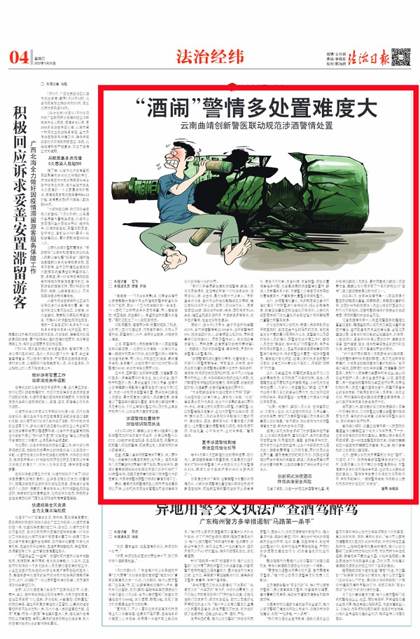 曲靖公安机关联合多部门对涉酒案件进行普法,以本地的典型案例、直观的图片、具体的数据进行定期宣传。利用短视频、漫画、音频等多种方式,进行多方位全方面的宣传。让各个年龄段和文化层次的人群都能看得懂,认识到危害。同时动员社会各界力量,倡导健康文明的娱乐行为。加强治安管理处罚法中有关约束醒酒、醉酒人员违法同等处罚的法治宣传教育,让酗酒滋事者打消钻法律空子的念头。